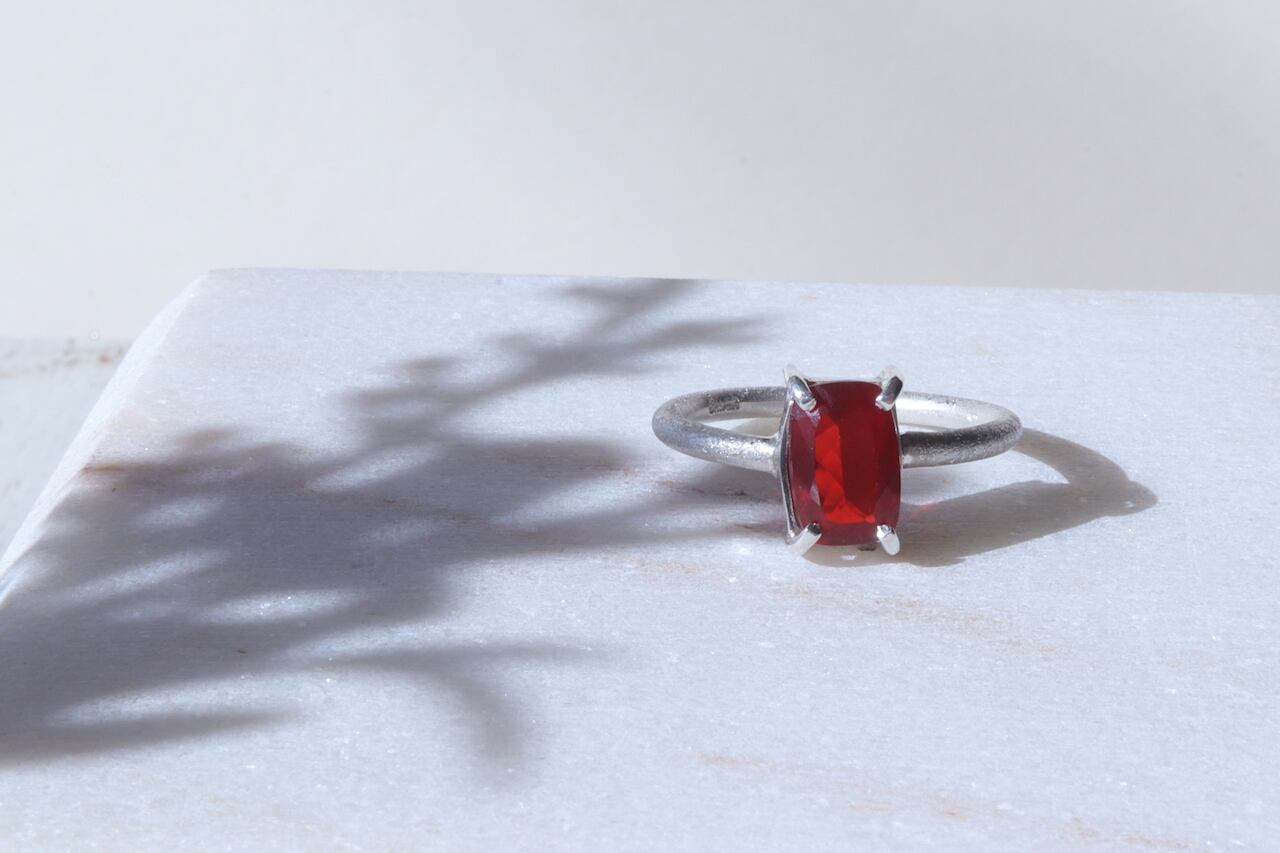 燃えるような緋色がまぶしいファイヤーオパールのスクエアリング。